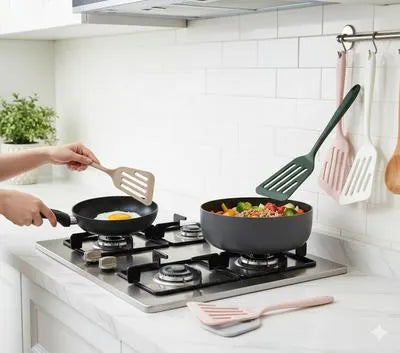 • ?Elevate your kitchen aesthetic and cooking performance with this set of premium silicone slotted turners. Designed with a modern, minimalist silhouette, these spatulas are the perfect blend of form and function, ensuring your non-stick cookware remains scratch-free while you cook with precision.